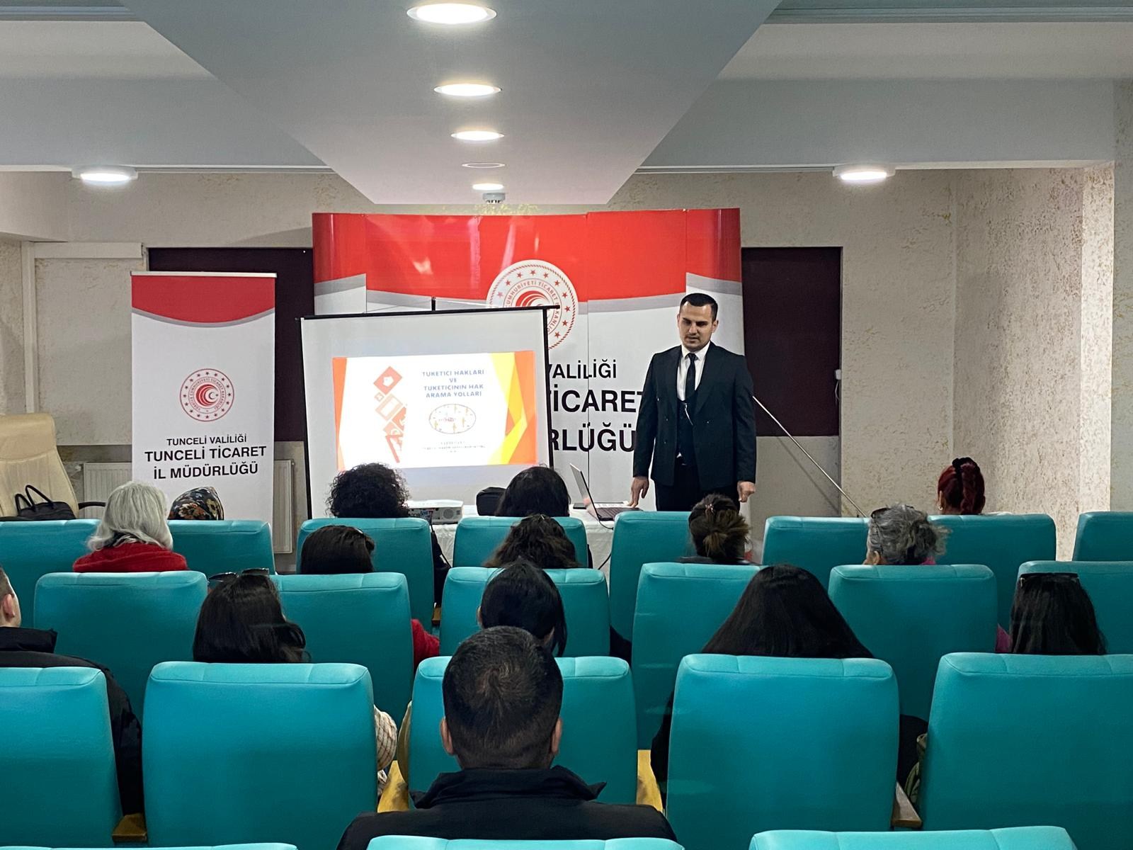 Ticaret Bakanlığı Tunceli Ticaret İl Müdürlüğü Konferans Salonu’nda düzenlenen eğitimde, Tüketici Hakem Heyeti Raportörü Fatih Özen tarafından kursiyerlere bilinçli tüketici olma, tüketicilerin sahip olduğu haklar, alışverişlerde dikkat edilmesi gereken hususlar ve karşılaşılabilecek sorunlarda başvuru yolları hakkında bilgilendirme yapıldı. Eğitimde ayrıca tüketicilerin hak arama mekanizmaları ve Tüketici Hakem Heyetlerine başvuru süreçleri hakkında da detaylı bilgiler paylaşıldı.